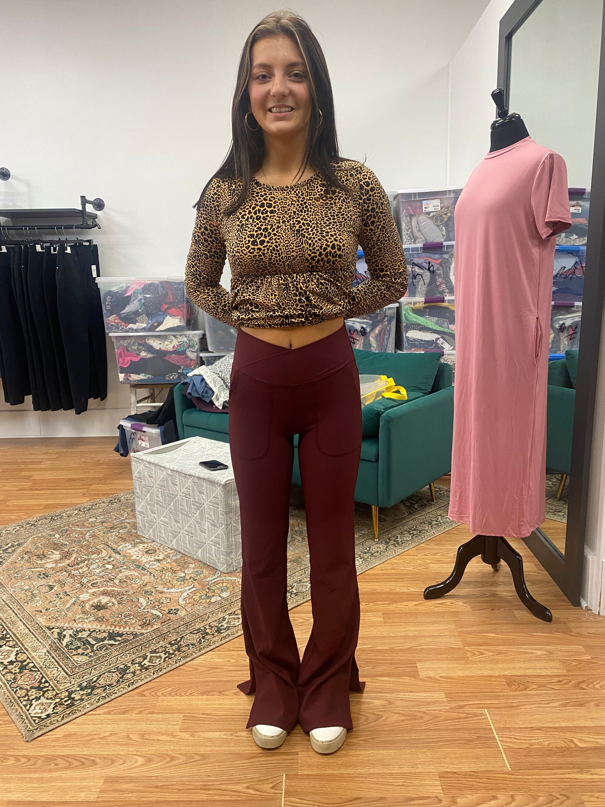 NYLON RIB V WAIST CORSSOVER FLARED LEGGINGS